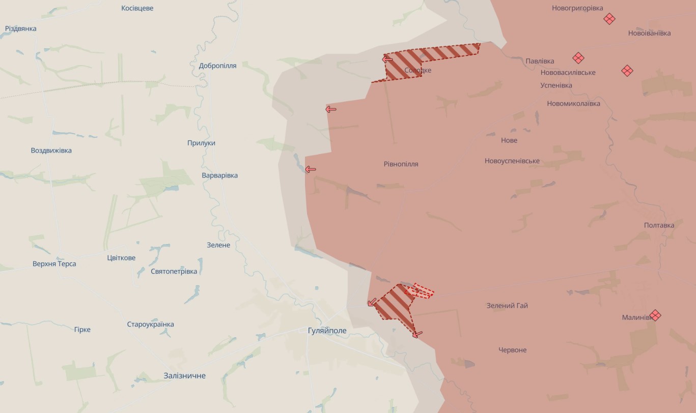 У Пологівського районі Запорізької області окупаційні російські війська взяли під свій контроль села Солодке та Затишшя. Ворожа армія просувається під Гуляйполем. Відповідне оновлення на мапі бойових дій сьогодні, 3 грудня, позначив український аналітичний проєкт DeepState, передає "Справжнє".