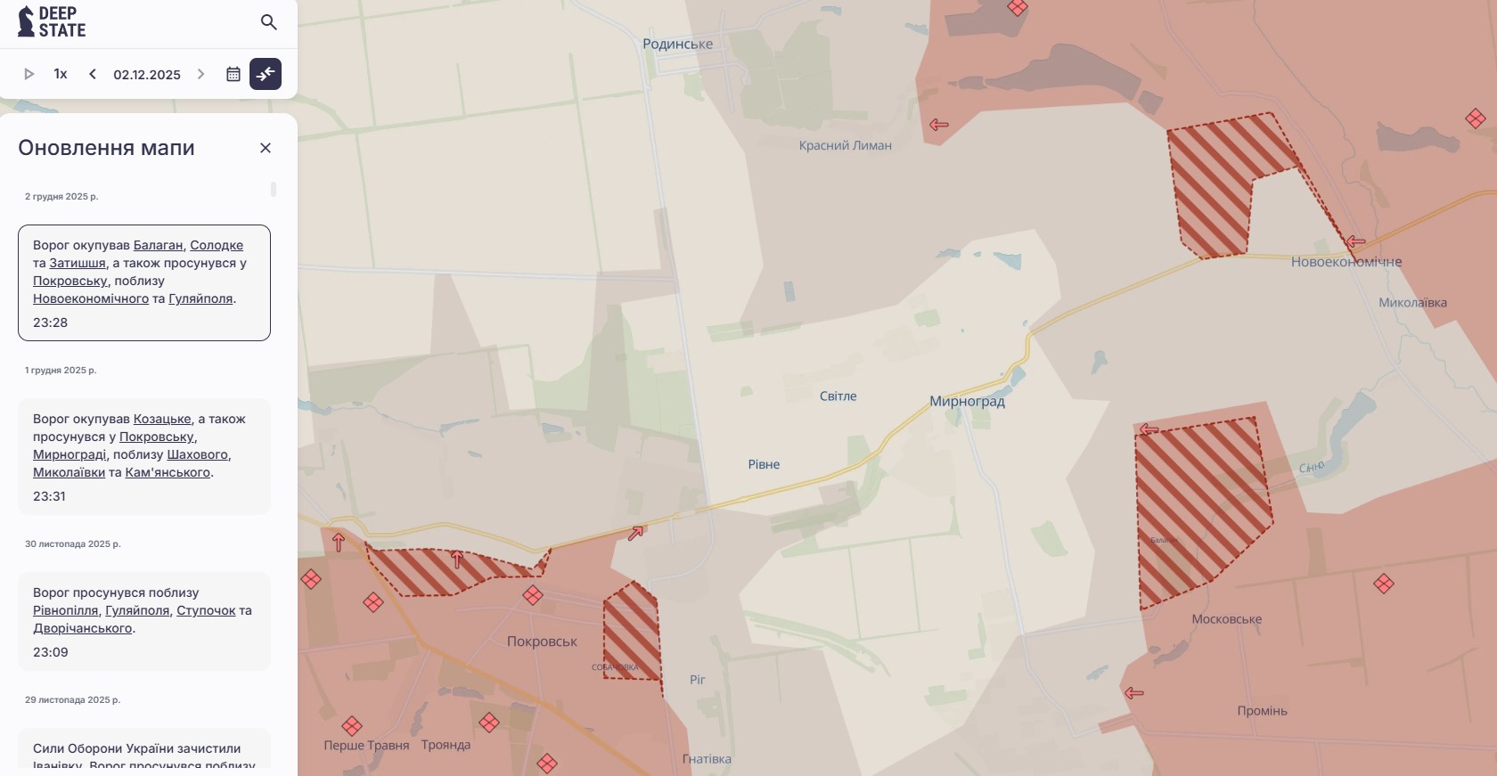 За оновленими даними, на Донеччині загарбники окупували село Балаган Покровського району. Окрім того, РФ, на думку експертів DeepState, мала успіхи у самому Покровську та в районі селища Новоекономічне.