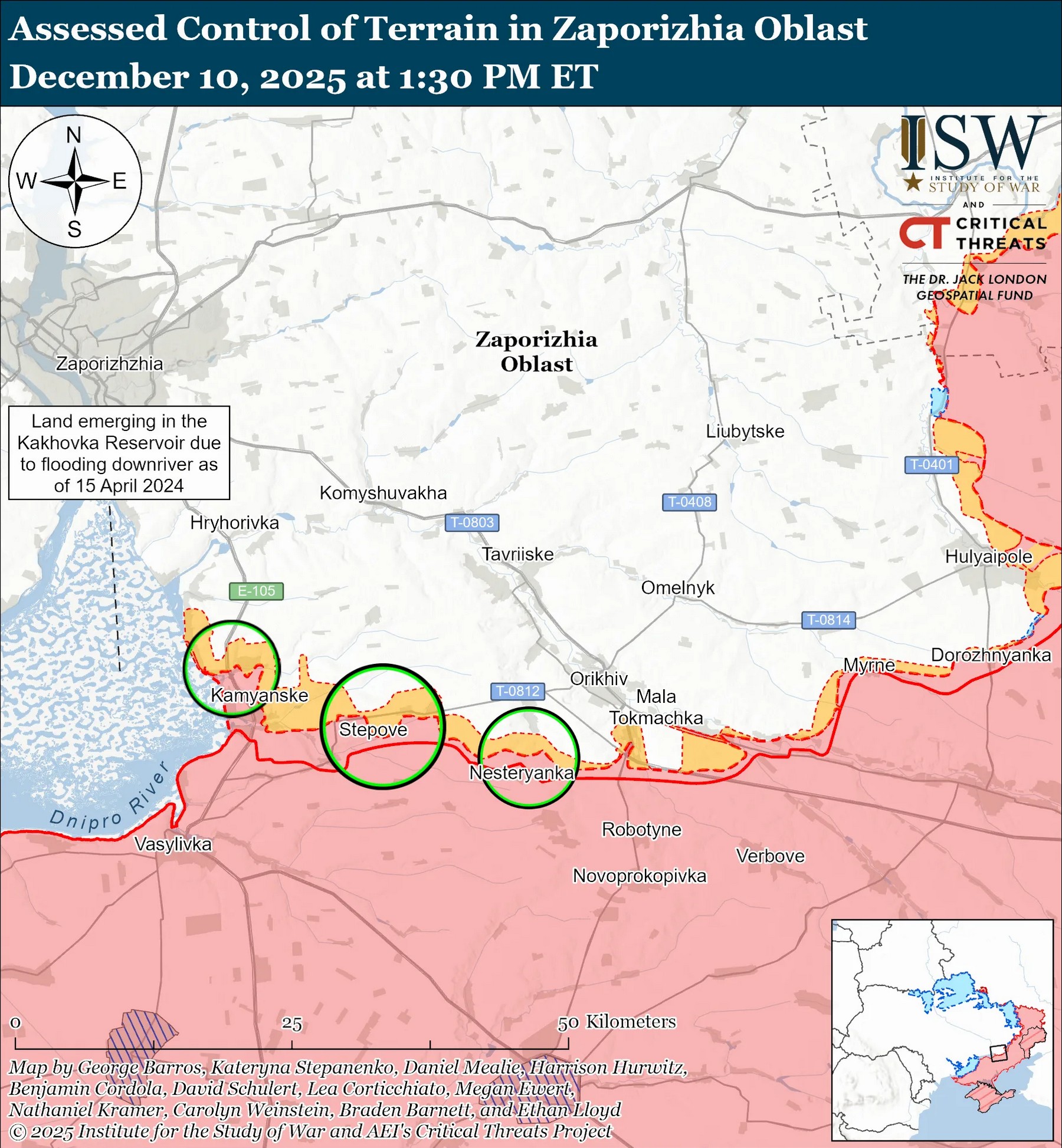 "10 грудня російські війська продовжили наступальні операції на заході Запорізької області, але не просунулися вперед", – заявили в ISW, коментуючи ситуацію на Оріхівському відтинку фронту.