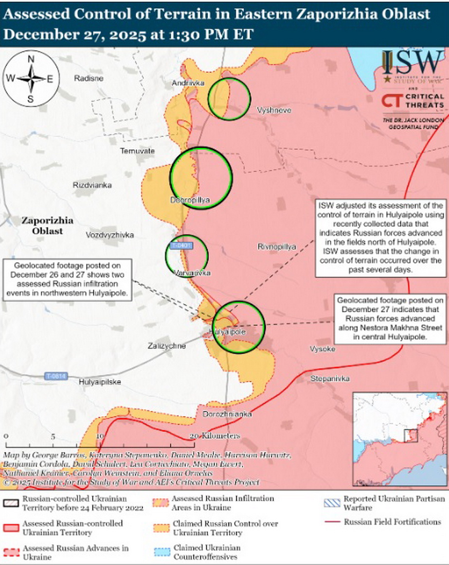 Окрім цього, ISW зазначає, що 27 грудня російські війська продовжували наступальні дії на заході Запорізька область, однак не мали успіхів. Бої тривали на північний захід, захід і південний схід від Оріхова.