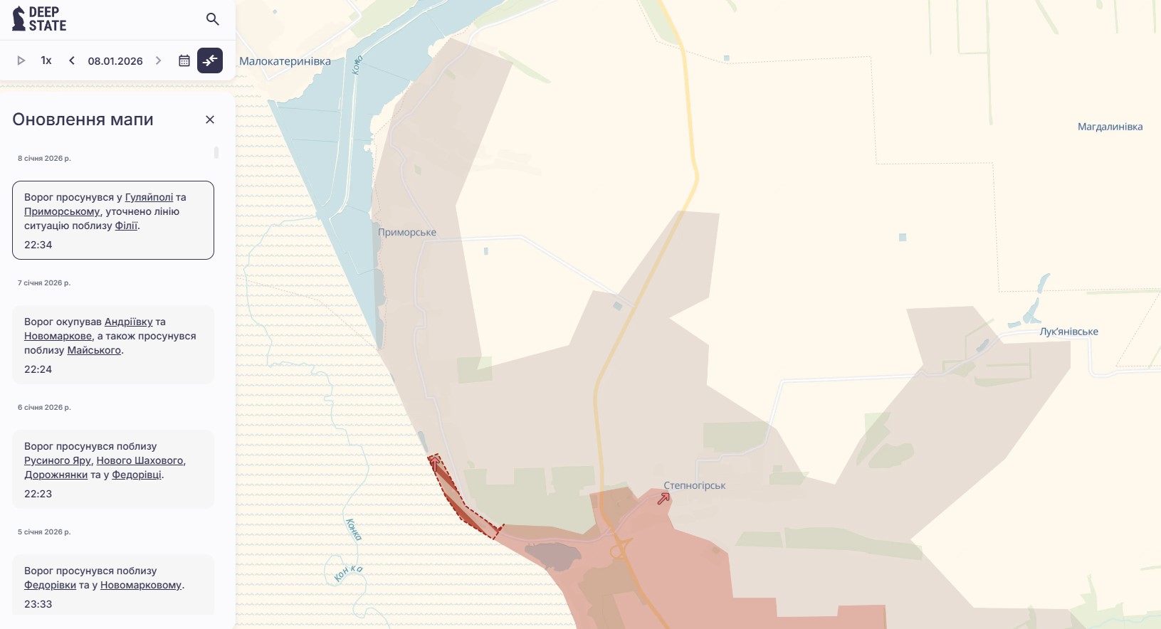 Нові просування російських окупаційних військ на заході та сході Запорізької області український аналітичний проєкт Deepstate позначив на мапі в ніч на 9 січня, інформує "Справжнє".