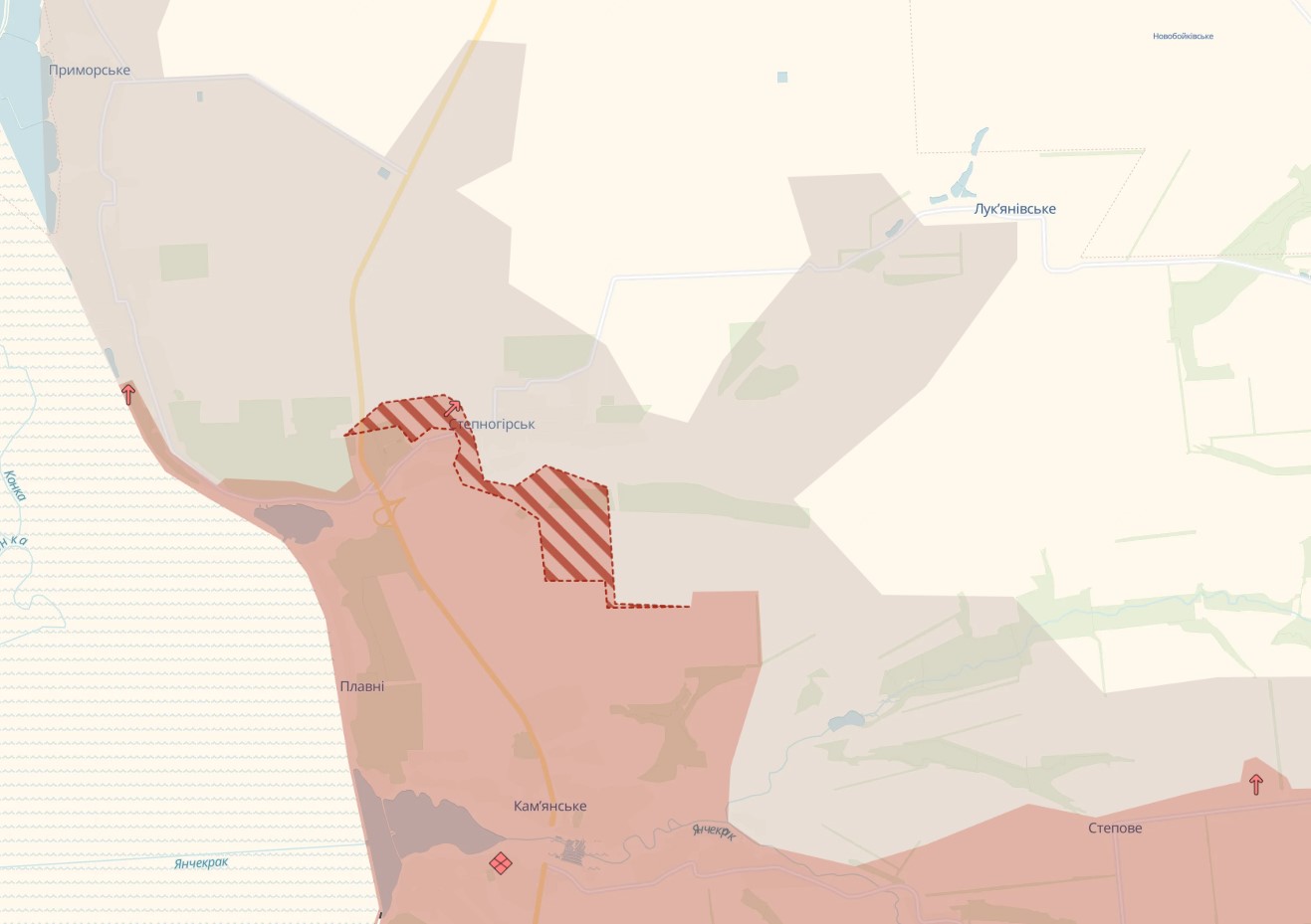 Російські окупаційні війська мали успіхи поблизу та в самому селищі Степногірськ Василівського району Запорізької області. Про це в ніч на 14 січня повідомив український аналітичний проєкт DeepState, передає "Справжнє".
