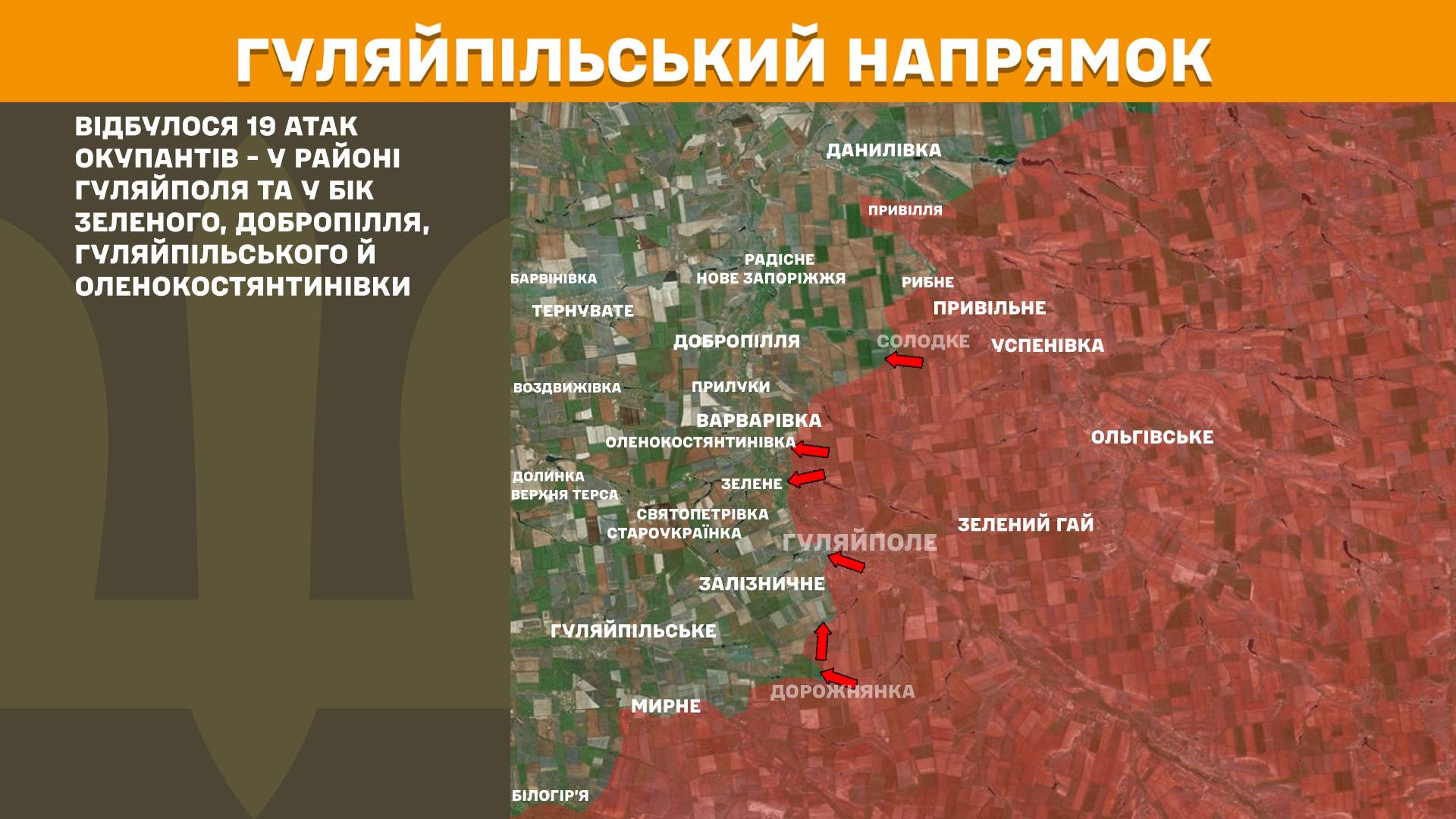 На Гуляйпільському напрямку відбулися 19 атак окупантів – у районі Гуляйполя та у бік Зеленого, Добропілля, Гуляйпільського й Оленокостянтинівки.