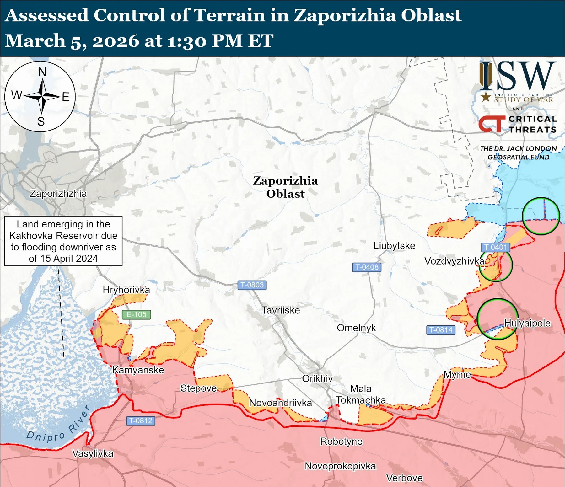На геолокованих кадрах від 5 березня українські сили завдавали ударів по росіянах на захід від Варварівки (на північ від Гуляйполя). За оцінками ISW, російська місія проникнення не змінила контролю над місцевістю.