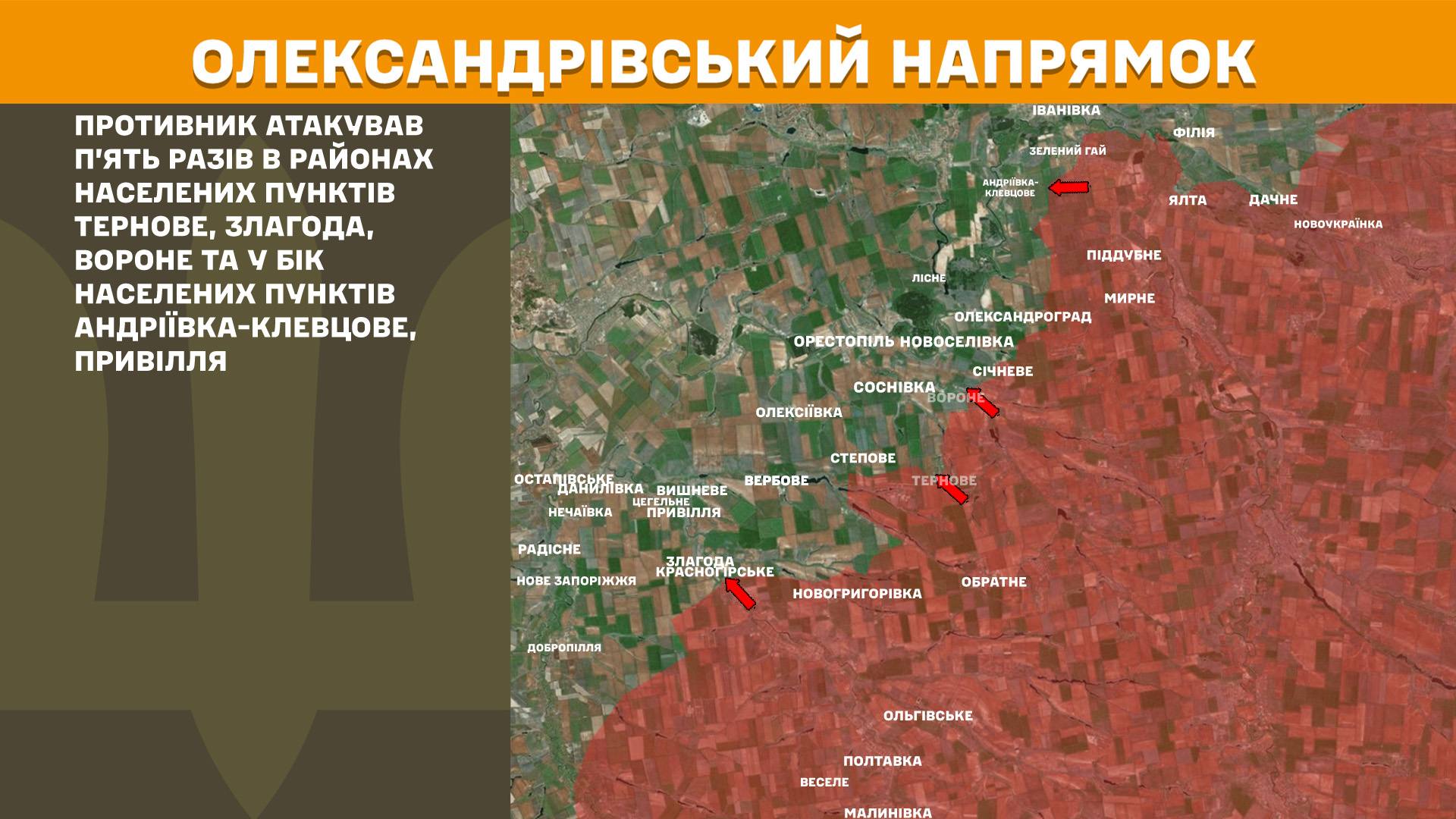 На Олександрівському напрямку (межі Дніпровщини та Запоріжжя) армія РФ наступала в районах Тернового, Злагоди, Вороного та в бік населених пунктів Андріївка-Клевцове й Привілля. Там відбили п’ять атак.