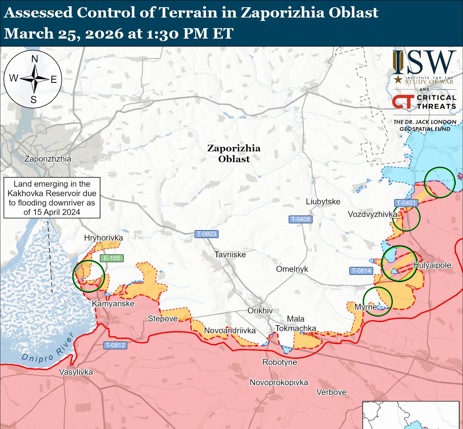 "25 березня російські війська продовжили наступальні операції на заході Запорізької області, але не просунулися вперед", – заявили експерти.