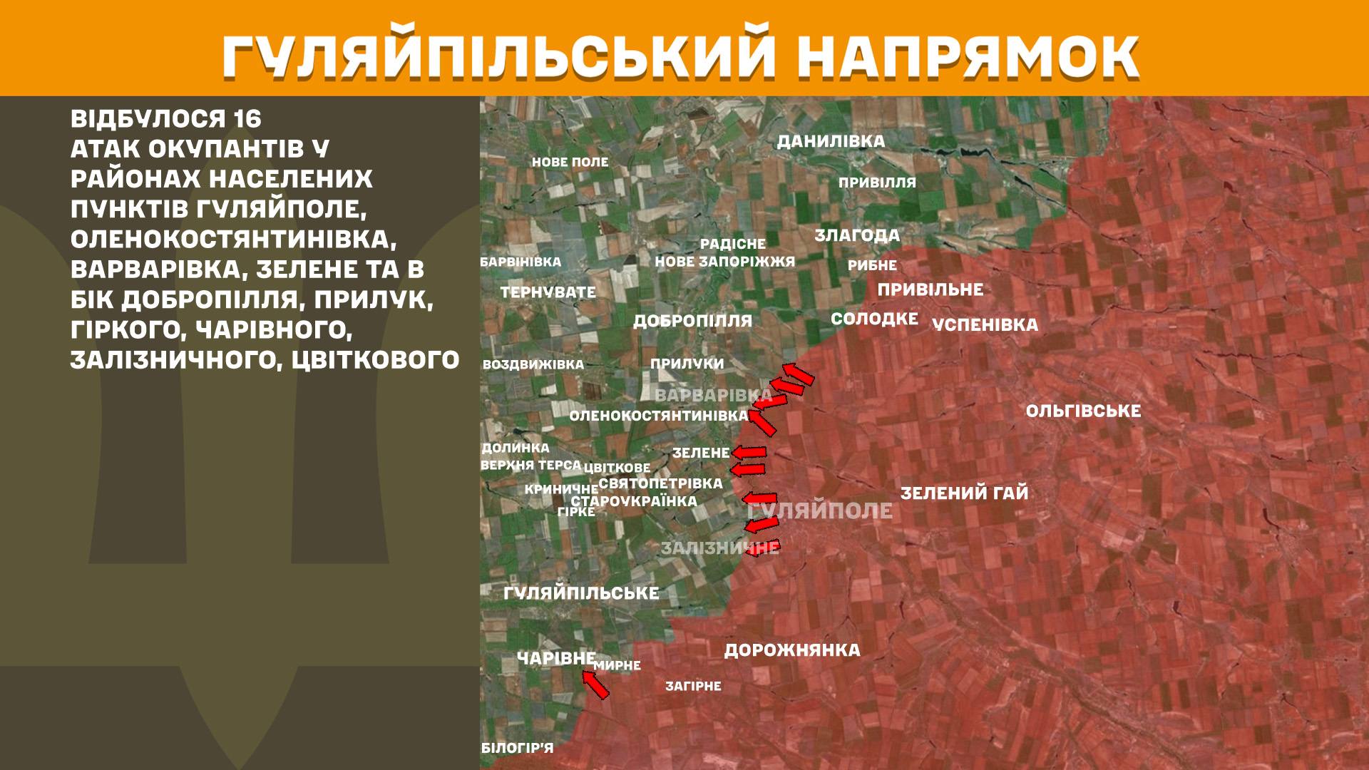 На Гуляйпільському напрямку відбулися 16 атак у районах населених пунктів Гуляйполе, Оленокостянтинівка, Варварівка, Зелене та в бік Добропілля, Прилук, Гіркого, Чарівного, Залізничного та Цвіткового.