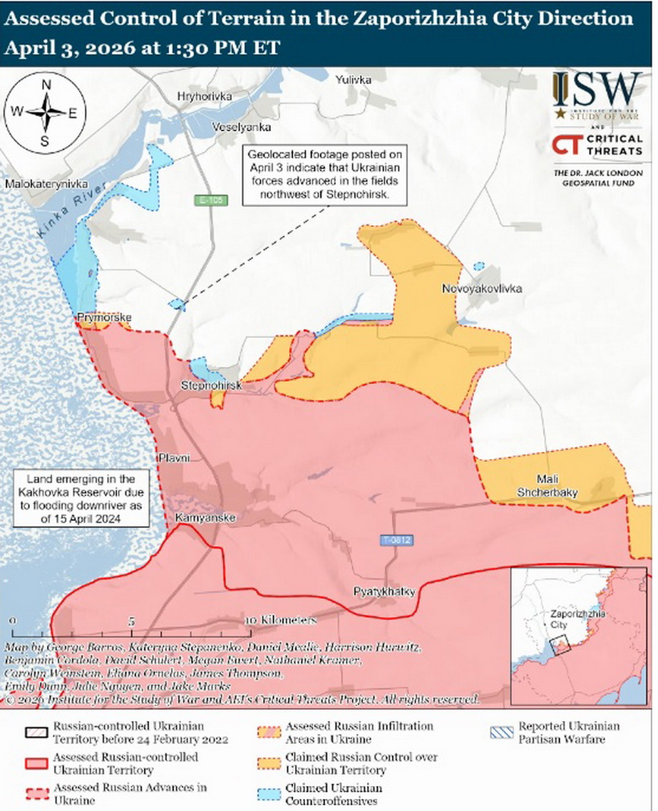 Посилаючись на геолоковані відеозаписи від 2 квітня, аналітики констатують нещодавно просування українських військ на північний захід від Степногірська (Оріхівський напрямок).