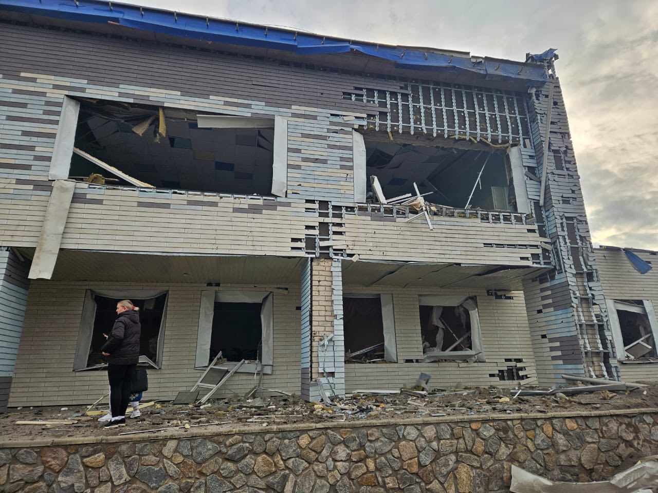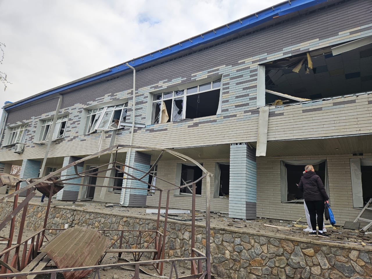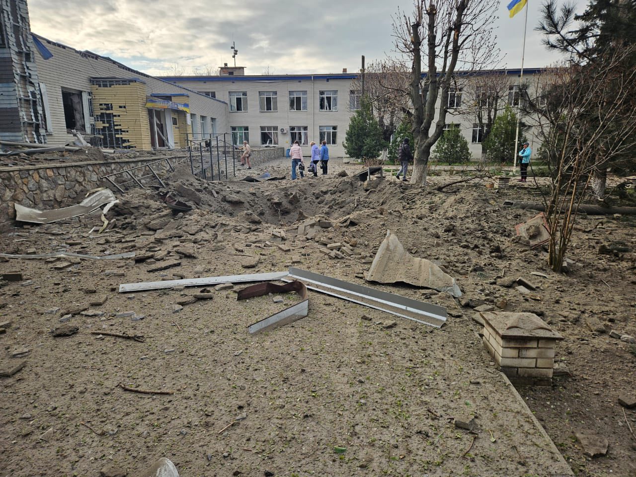 Будівля навчального закладу зазнала серйозних пошкоджень: вибуховою хвилею вибиті вікна на кількох поверхах, частково зруйновані фасад і покрівля. На пришкільній території розкидані уламки, утворилася вирва на місці "прильоту”.