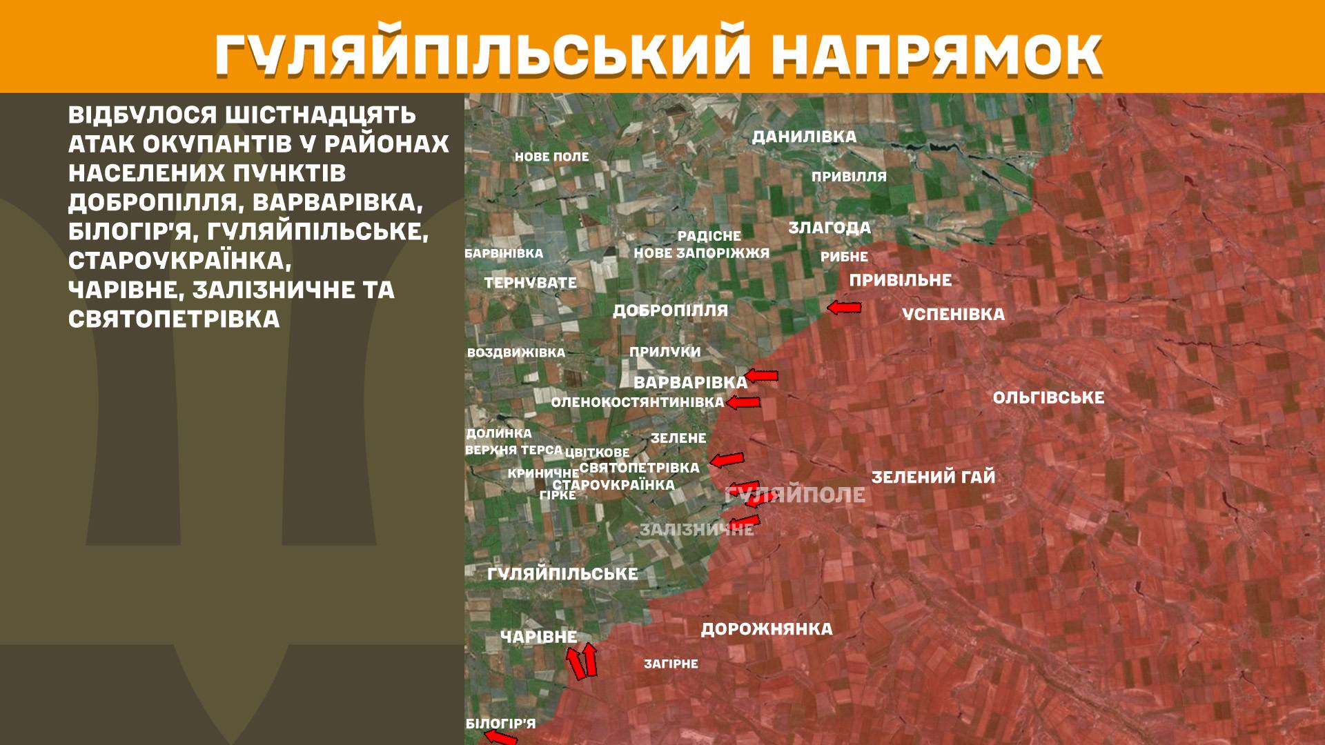 На Гуляйпільському напрямку відбулися шістнадцять атак у районах населених пунктів Добропілля, Варварівка, Білогір’я, Гуляйпільське, Староукраїнка, Чарівне, Залізничне та Святопетрівка.