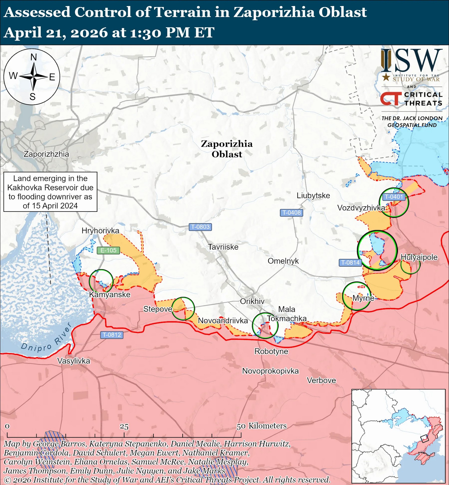 За оцінками аналітиків, 21 квітня українські війська проводили контратаки на заході Запорізької області, де наступальні операції продовжували окупанти.